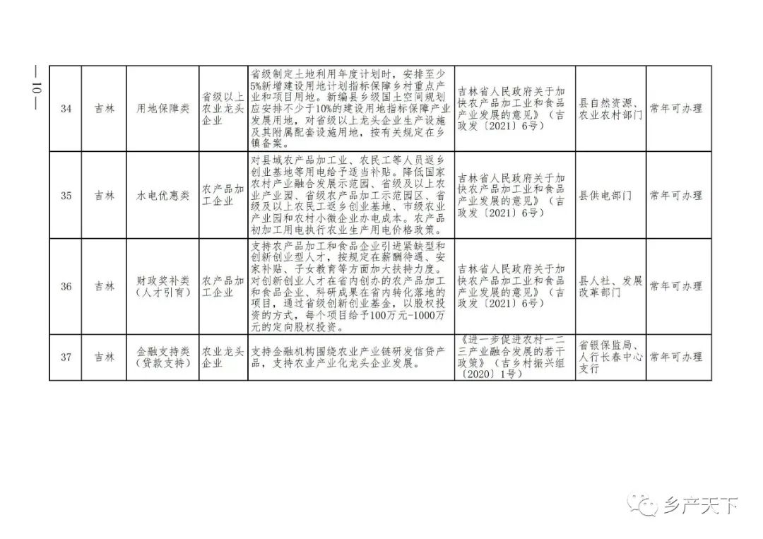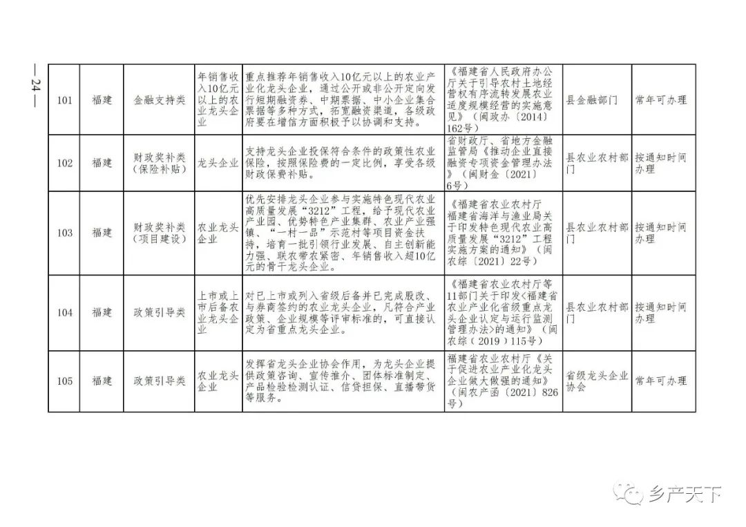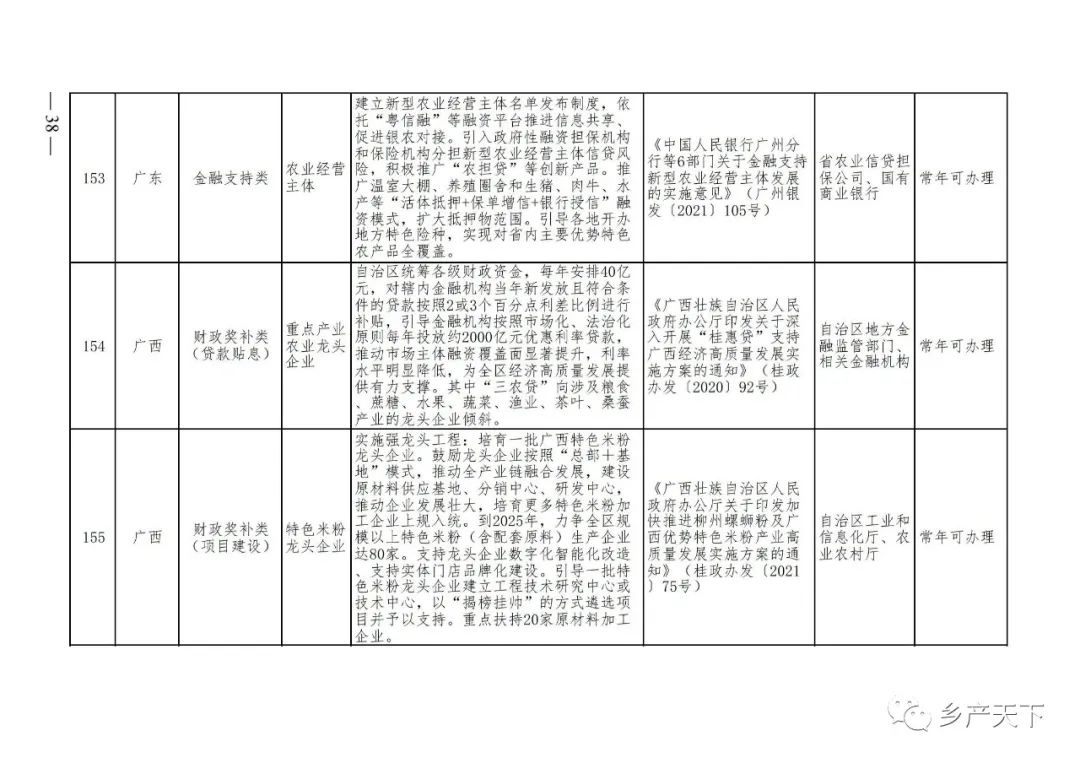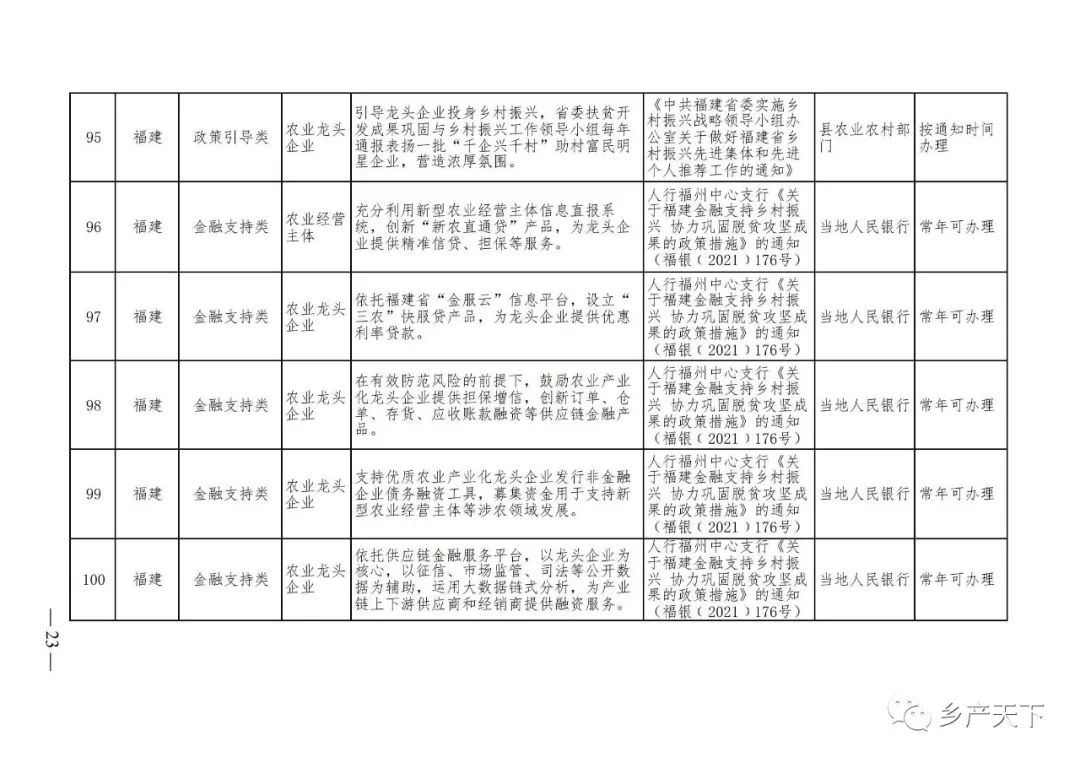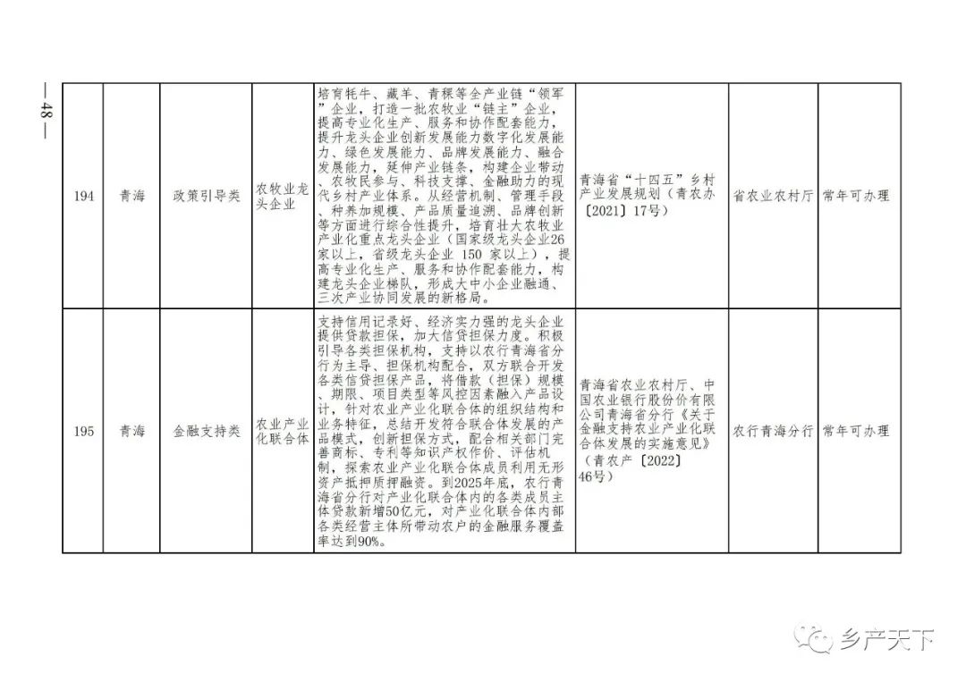 《清單》按照“政策類別、支持對象、具體內容、政策依據、辦理部門、辦理時間”進行梳理,共涉及“財政獎補、金融支持、用地保障、稅費減免、水電優惠、政策引導”等六大類229條政策。《清單》通知,各地支持政策發生變化,要及時反饋,鄉村產業發展司將定期更新發布。